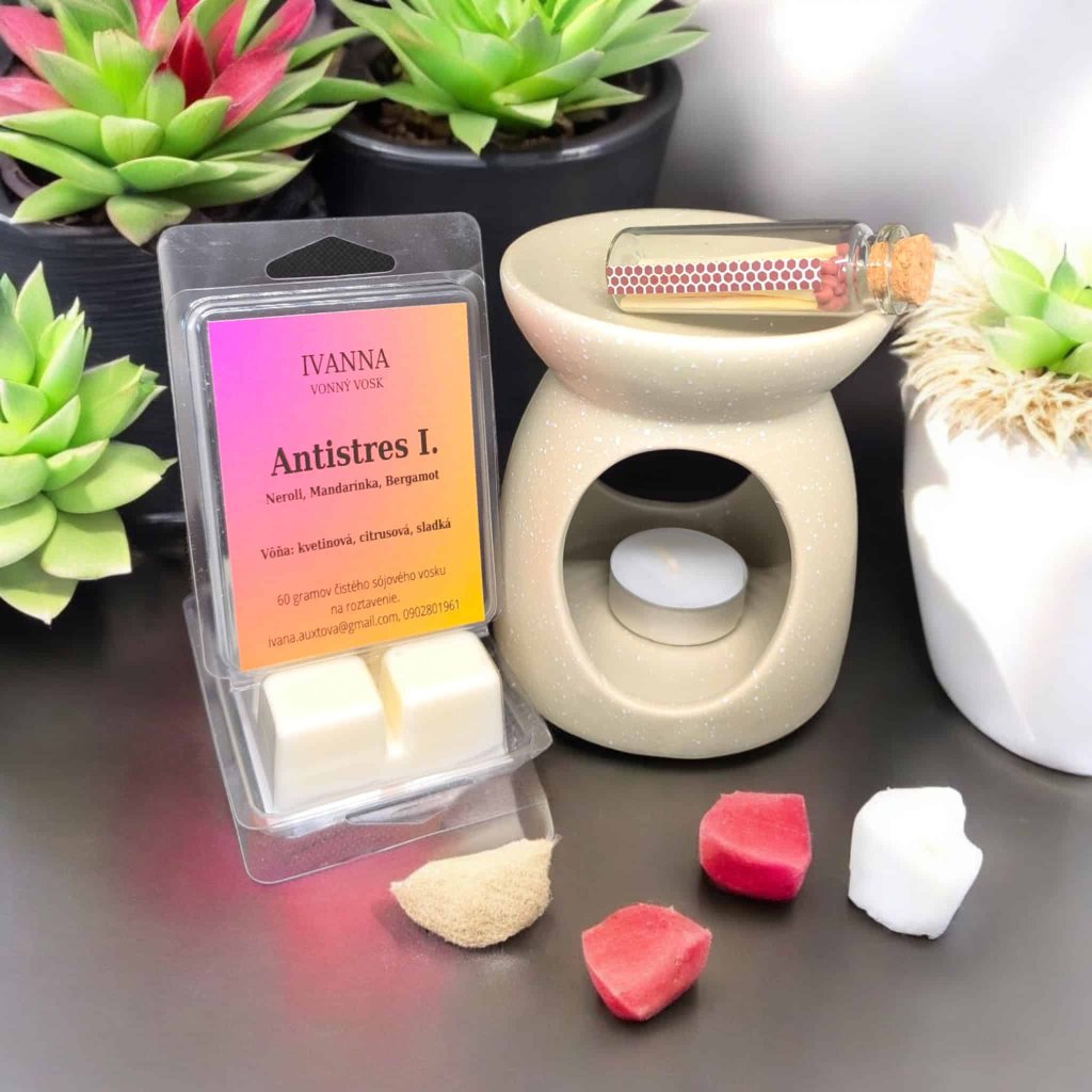 Najjednoduchšie, ako si vychutnať vonný vosk, je ihneď ho roztaviť. Čo v prípade, ak doma nemáte práve čajové sviečky alebo aromalampu? "Vonný set" je balíček, kde nájdete aromalampu, čajové sviečky, dizajnové zápalky a vonný vosk Antistres I. z mojej ručnej výroby. Stačí rozbaliť, použiť a zhlboka sa nadýchnuť.